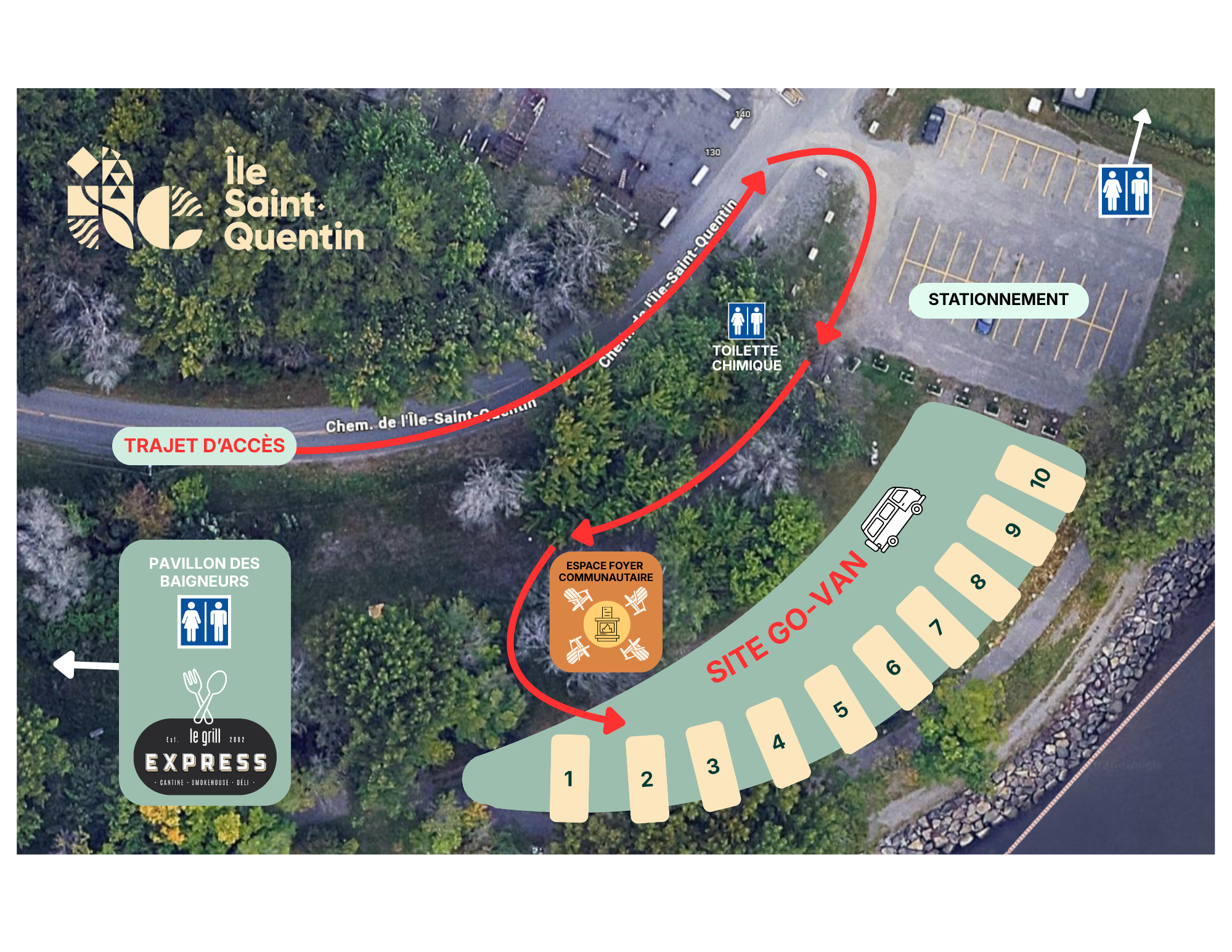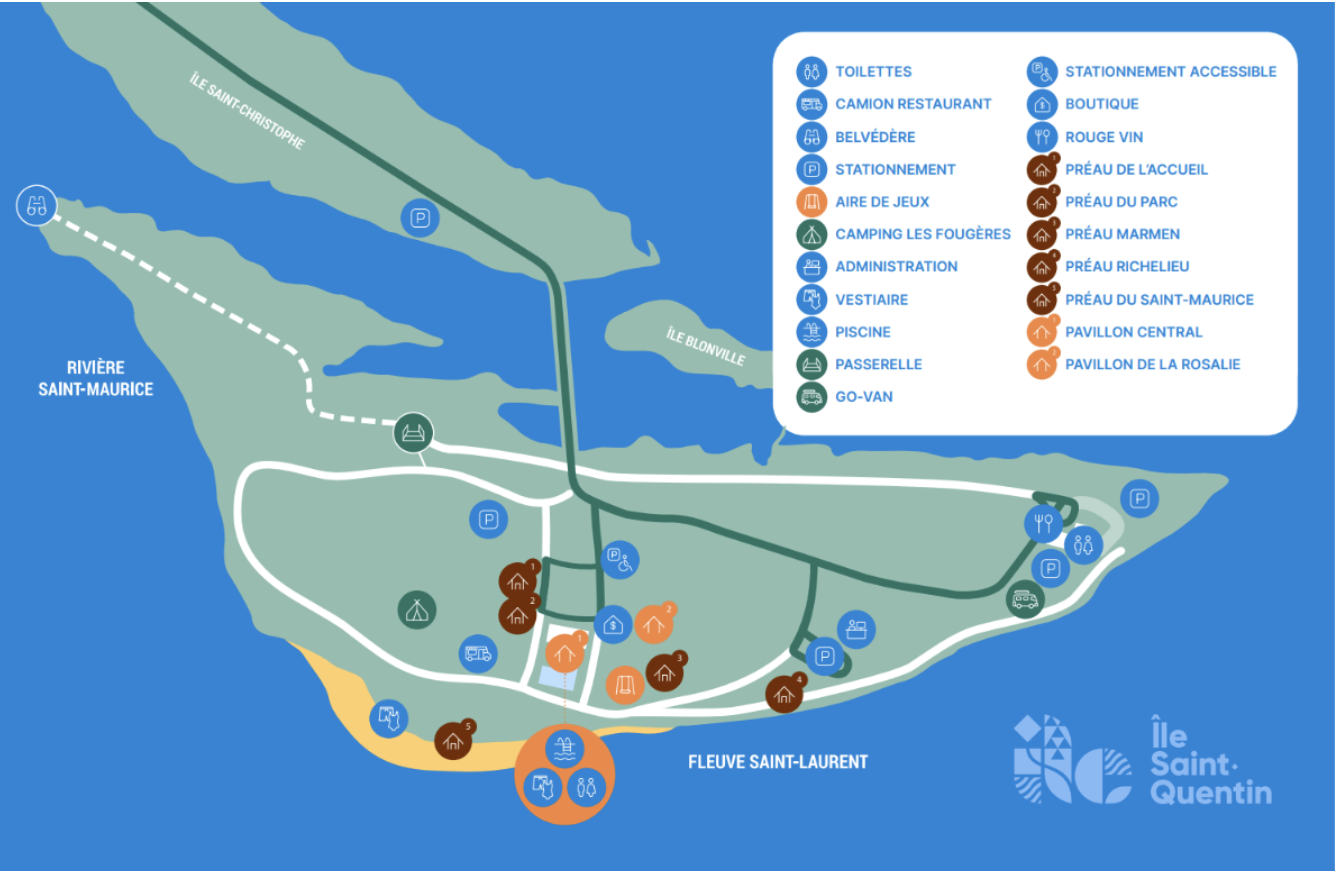 La location inclut uniquement votre emplacement. Les frais d’entrée sur le site ainsi que le stationnement ne sont pas compris (7 $ par véhicule et environ 2 $ par personne). Pour consulter la tarification complète : https://ilesaintquentin.com/tarifs/